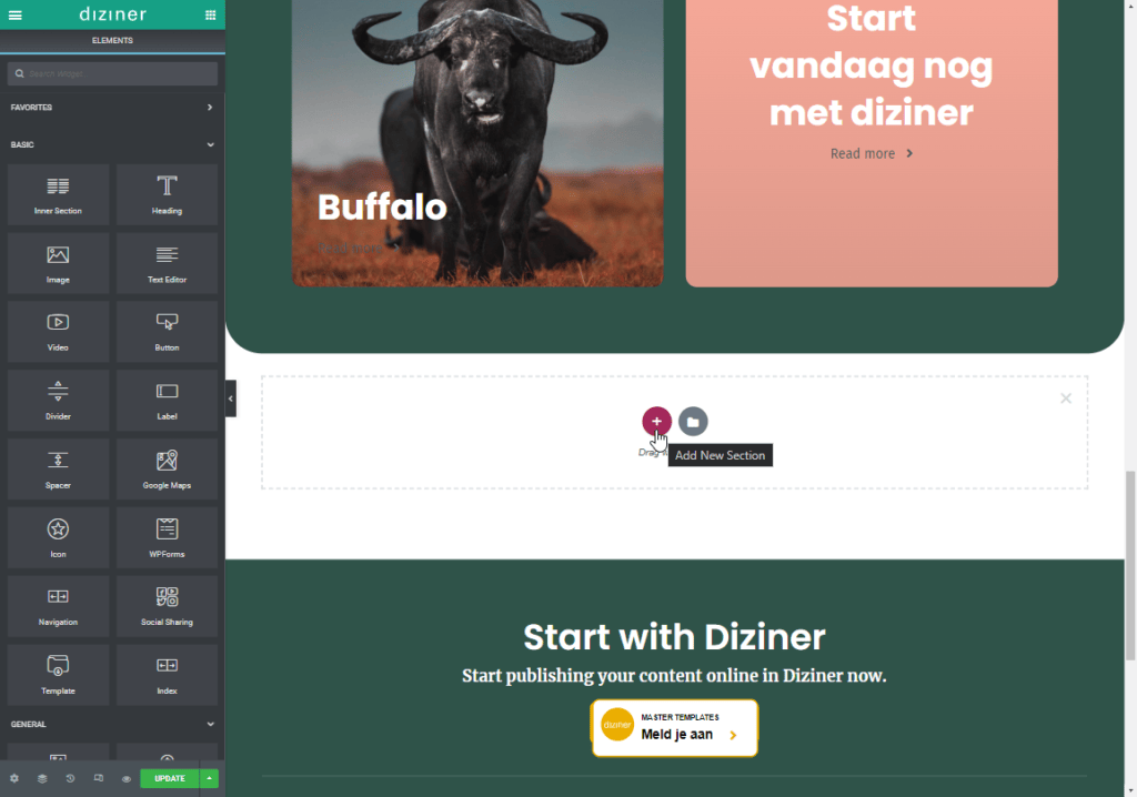 1. Voeg een nieuwe sectie toe op de pagina door op het blauwe plusje te klikken van de sectie waarboven je de index widget wil plaatsen;