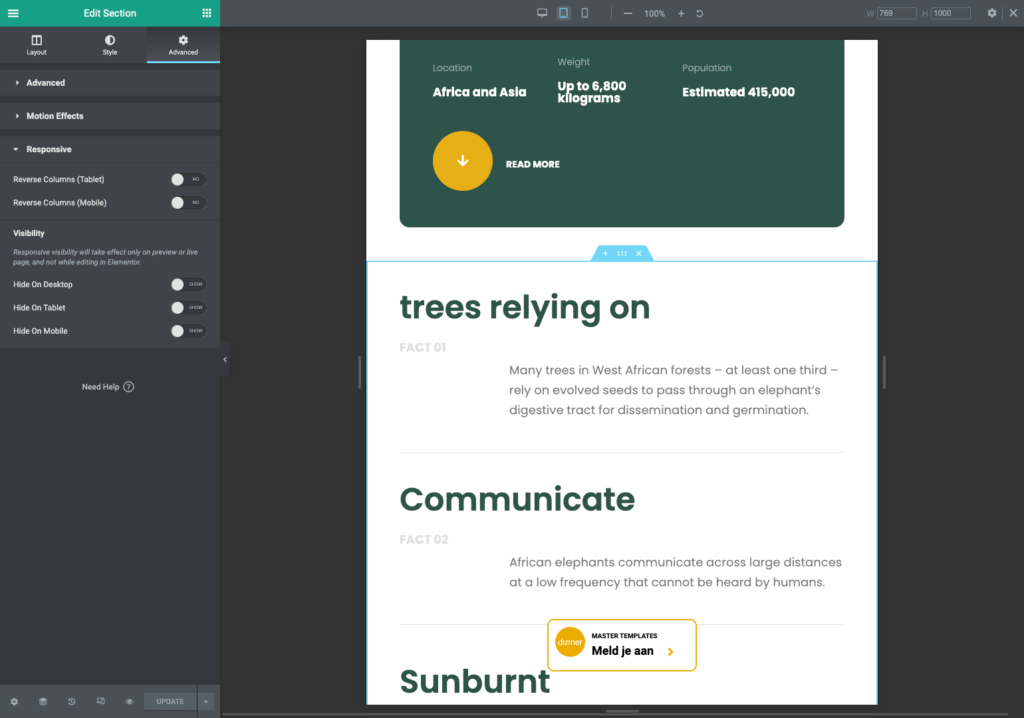 Wanneer een sectie uit twee of meerdere kolommen bestaat, zullen deze op desktop naast elkaar getoond worden. Maar op kleinere schermen, zullen deze kolommen onder elkaar worden getoond. Het kan daarbij voorkomen, dat de volgorde van kolommen liever wil omwisselen. Dit kan door middel van de reverse column optie.